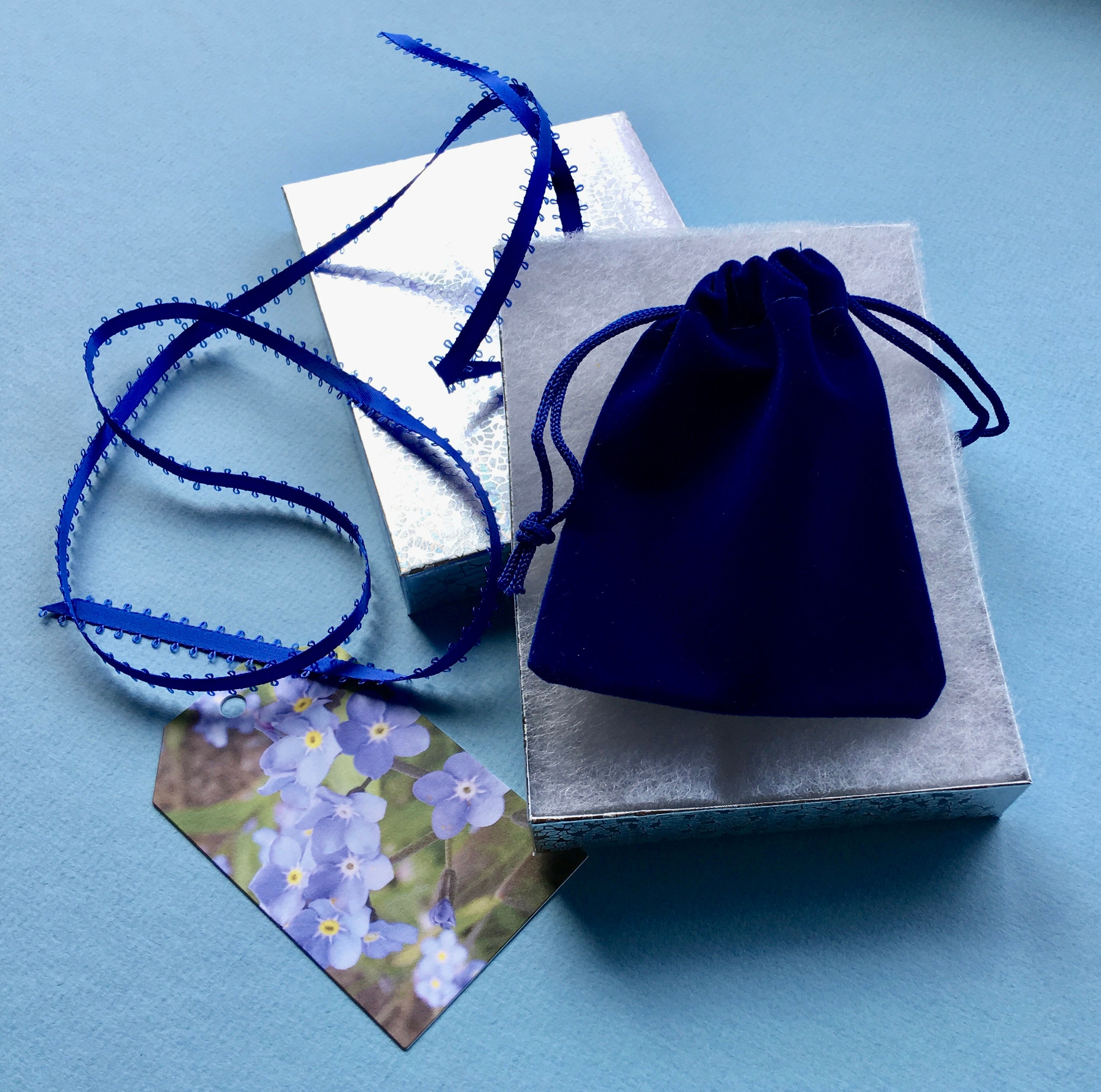 Your necklace will arrive in a lovely royal blue velveteen pouch with a story card and polishing cloth.